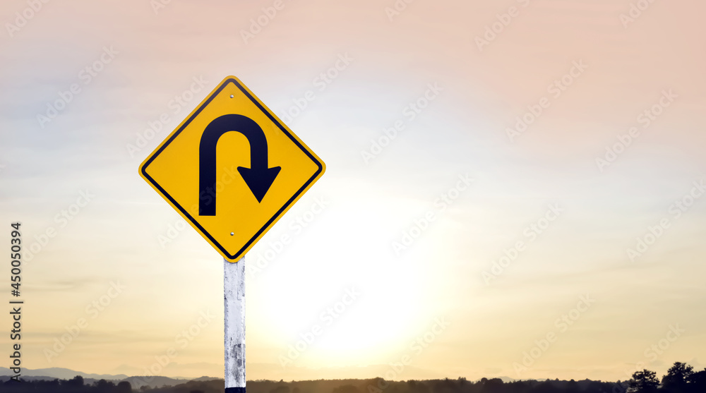 Right u-turn sign on pole, streetlights bokeh background. Concept for traffic sign at night.