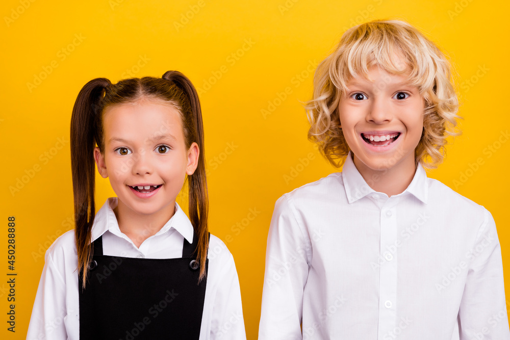 Photo of two funny positive schoolkids shiny white smile wear school uniform isolated yellow color background