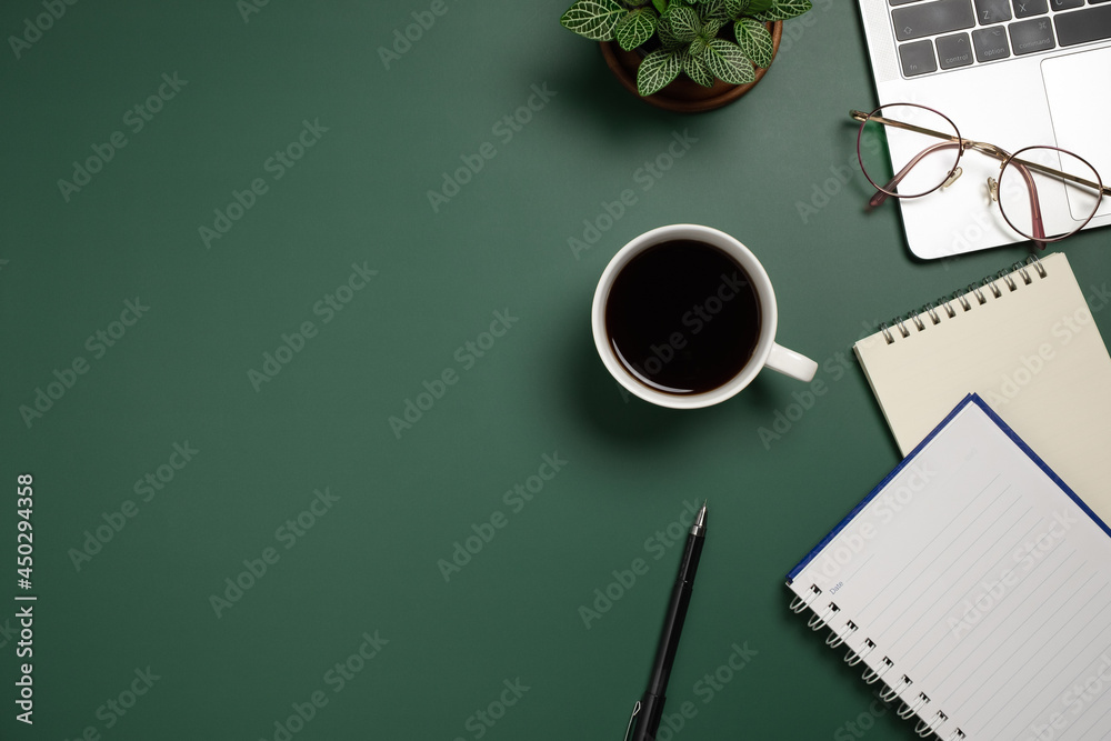 Desk office with laptop, blank notebook, flower, coffee cup and pen on green table. Flat lay top view copy space. Home office.