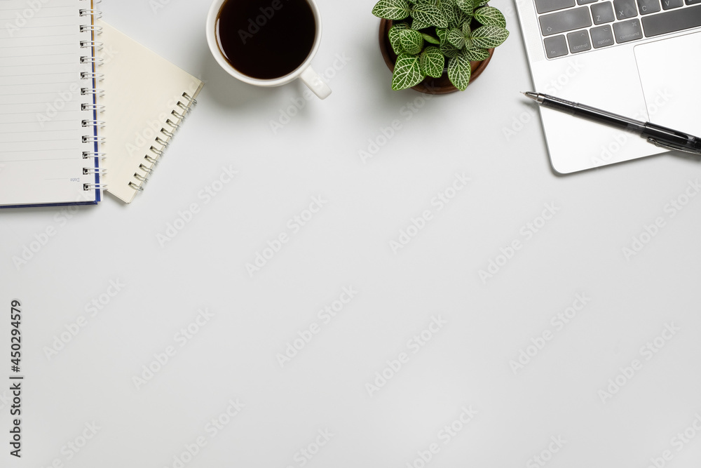 White desk with Laptop, blank notepad, flower, coffee cup and pen. Flat lay top view copy space.