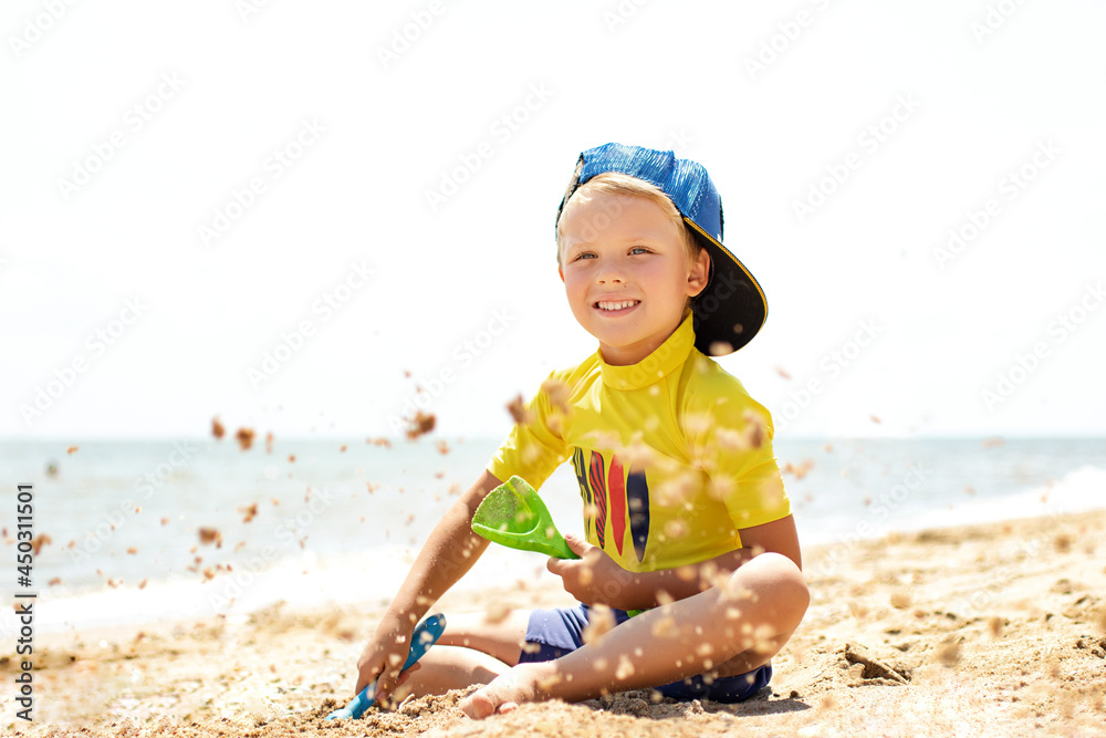 Pretty smiling boy sitting on the beach and playing with sand.Summer rest concept.