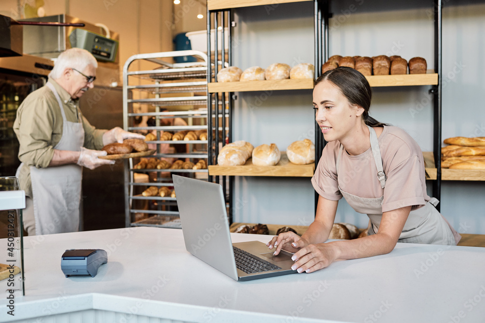 Young female baker using laptop against her mature male colleague carrying fresh bread