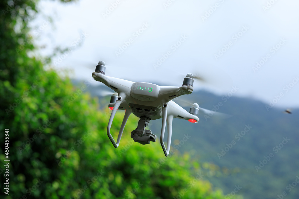 White drone with camera flying in summer mountains