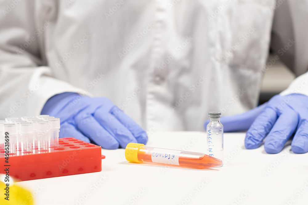 Test tube with covid sign near bottle with vaccine and scientist on the background