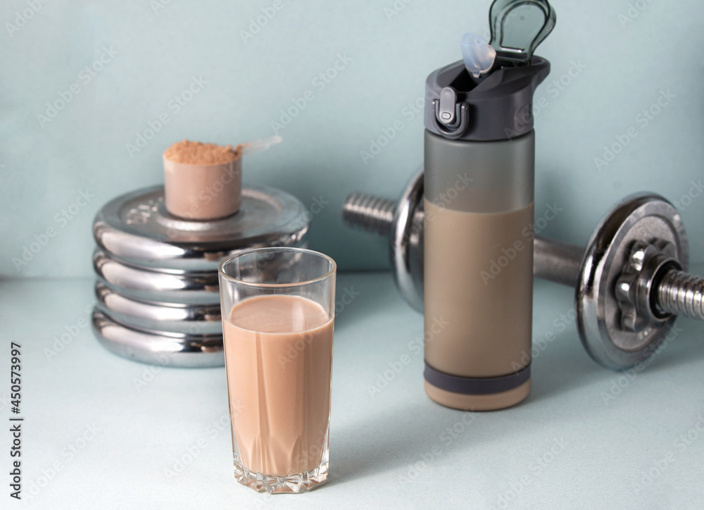 Sports nutrition concept. Coffee-colored protein is poured into a cube, a finished drink is poured into a glass glass, next to a shaker and a metal dumbbell. Horizontal orientation.