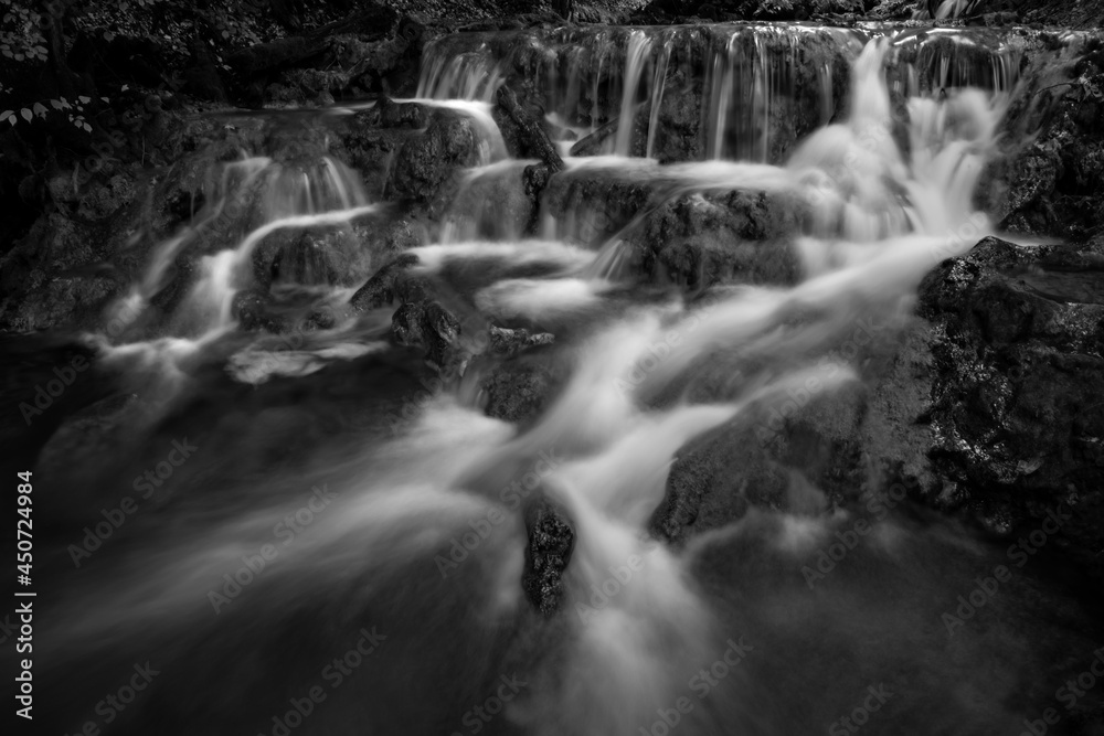 Wasserfall Bad Urach Uracher Wasserfall Baden-Württemberg Deutschland Graustufen schwarz weiß Kontrast Wald Bach NaturSchwäbische Alb Kaskade Sommer Regen Wanderung Langzeitbelichtung Stativ