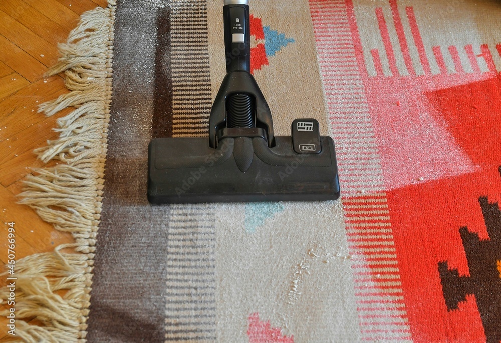 Vacuuming colorful carpet. Close-up of a vacuum cleaner over multicolored carpet