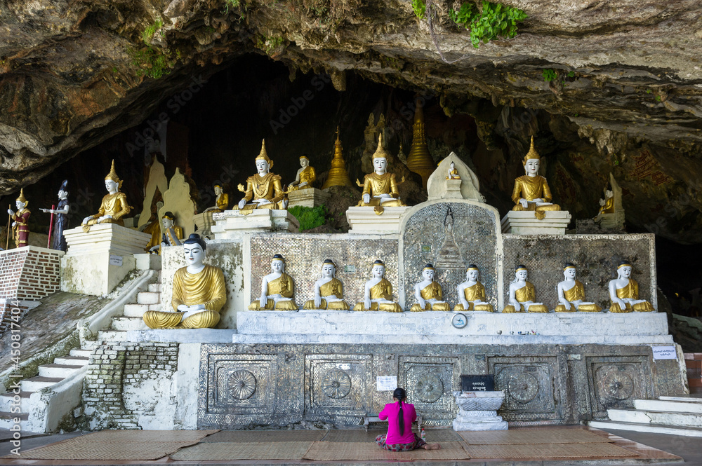 Myanmar (formerly Burma). Karen State. Hpa Han. Woman praying Buddha at Ya Teak Pyan cave