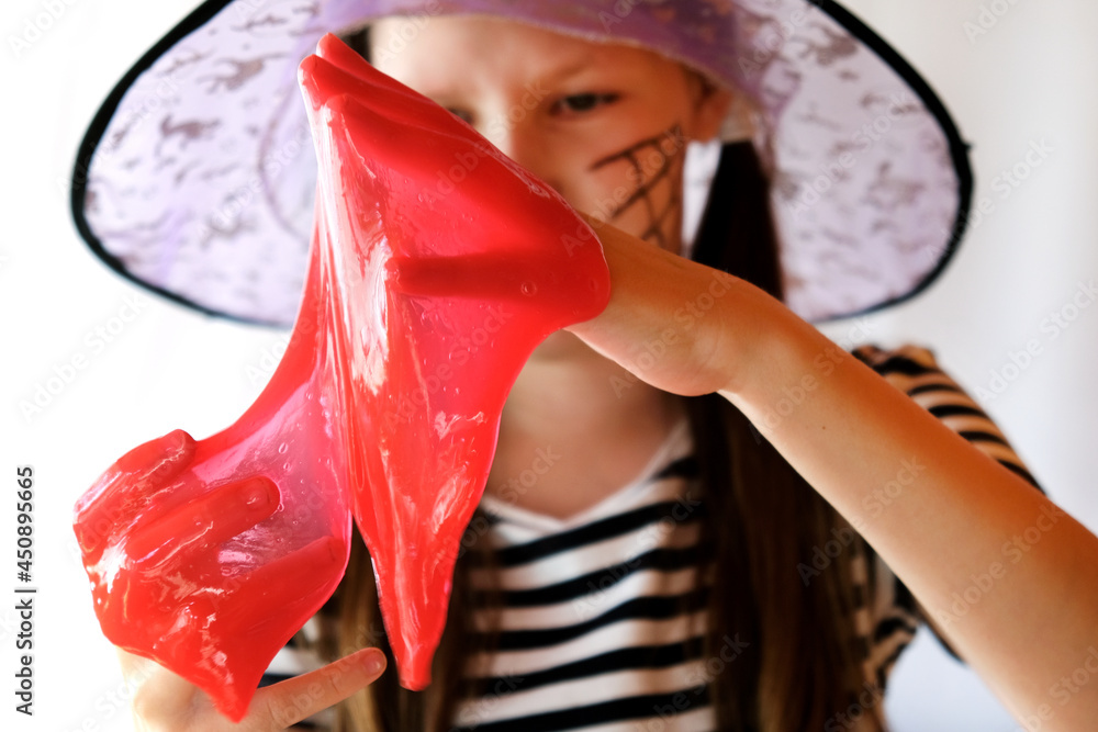 Cute girl playing with a red bloody glitter slime. She is having fun and making faces. Adorable girl holding and stretching a red goo slime. Halloween celebration, masquerade, trick or treat concept