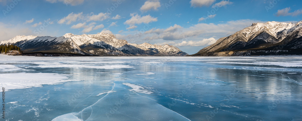 Frozen winter lake rocky mountain panoramic landscape. Blue ice winter Canadian landscapes panorama background