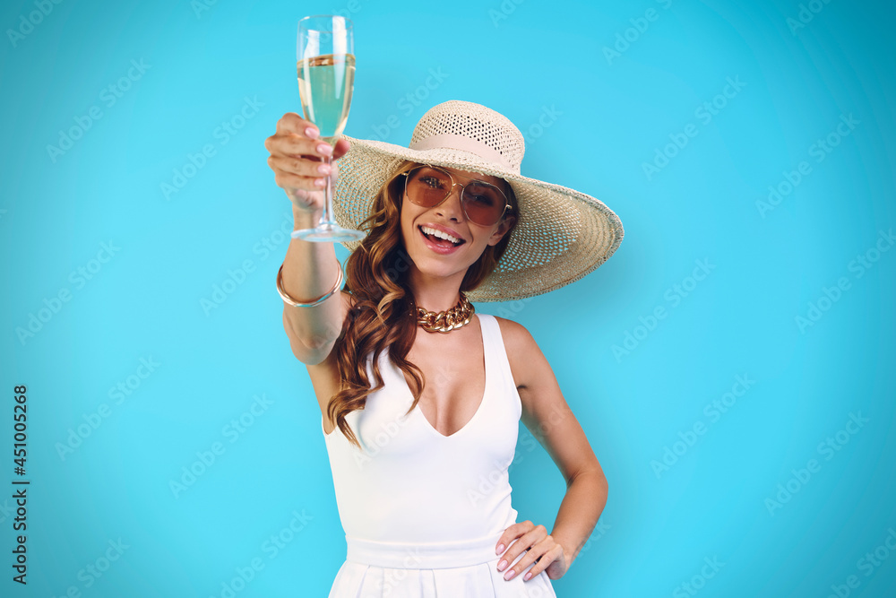 Beautiful young woman in elegant hat toasting with champagne and smiling while standing against blue background