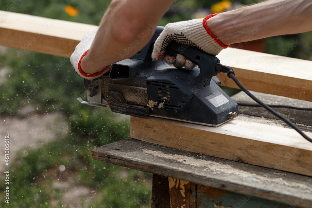 A carpenter planks wood with an electric plane. Woodworking carpentry. Close-up. Man in the garden sanding wooden planks. DIY home improvement, restoration, carpentry concept. Sawdust flies