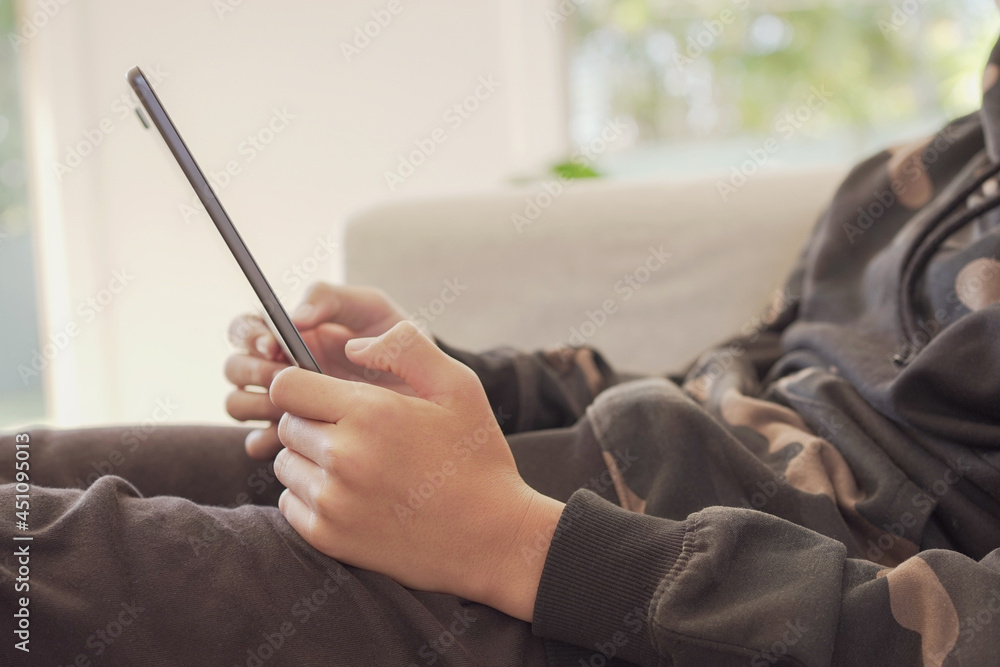 Preteen teen boy holding digital tablet at home, using online virtual class , social distancing, homeschooling, remote learning, new normal concept