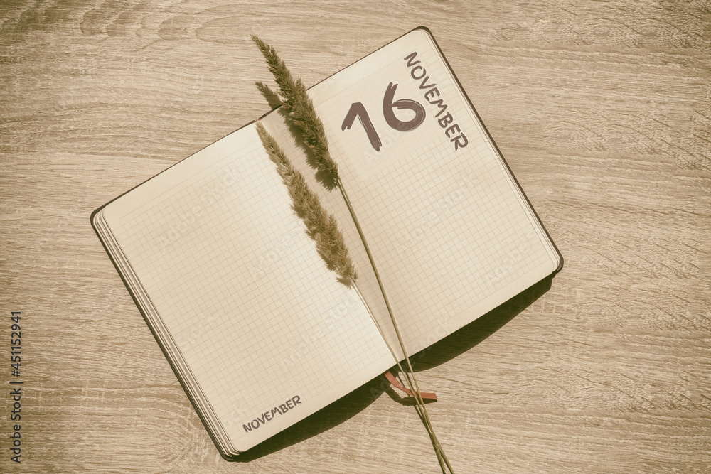 november 16. 16th day of month, calendar date.Blank pages of notebook are beige, with dried spikelets. Concept of day of year, time planner, autumn month.