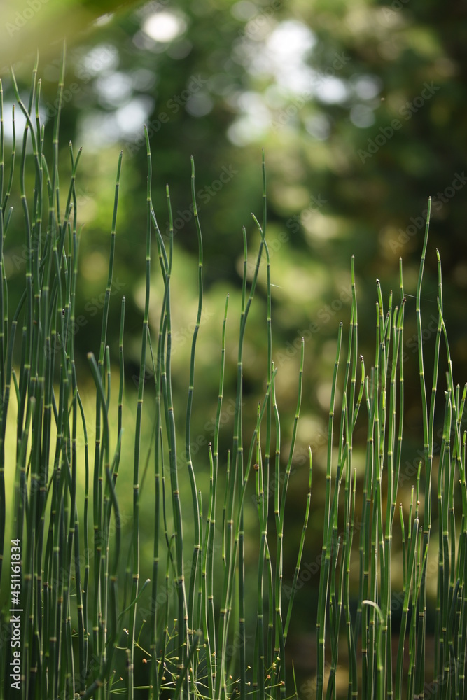 Equisetum hyemale on bokeh green garden background, ornamental plant for water gardens.