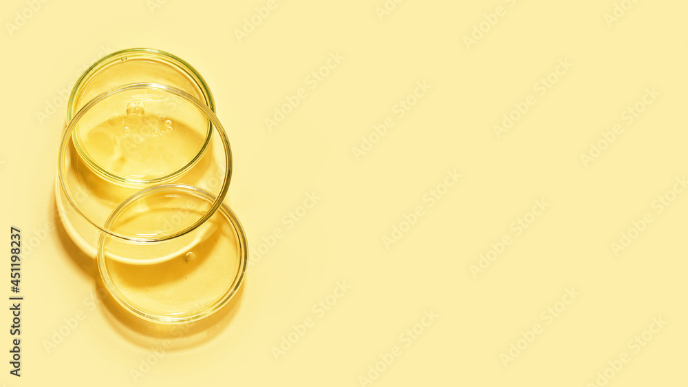 Top view of the petri dish staying on each other with bubbles inside.Warm yellow background with copy space.Mockup concept,place for design.Large banner with copy space.