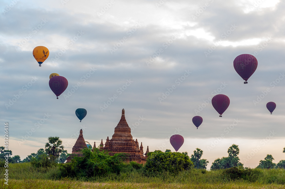 Myanmar (ex Birmanie). Bagan, Mandalay region. Hot air balloons in the plain of Bagan