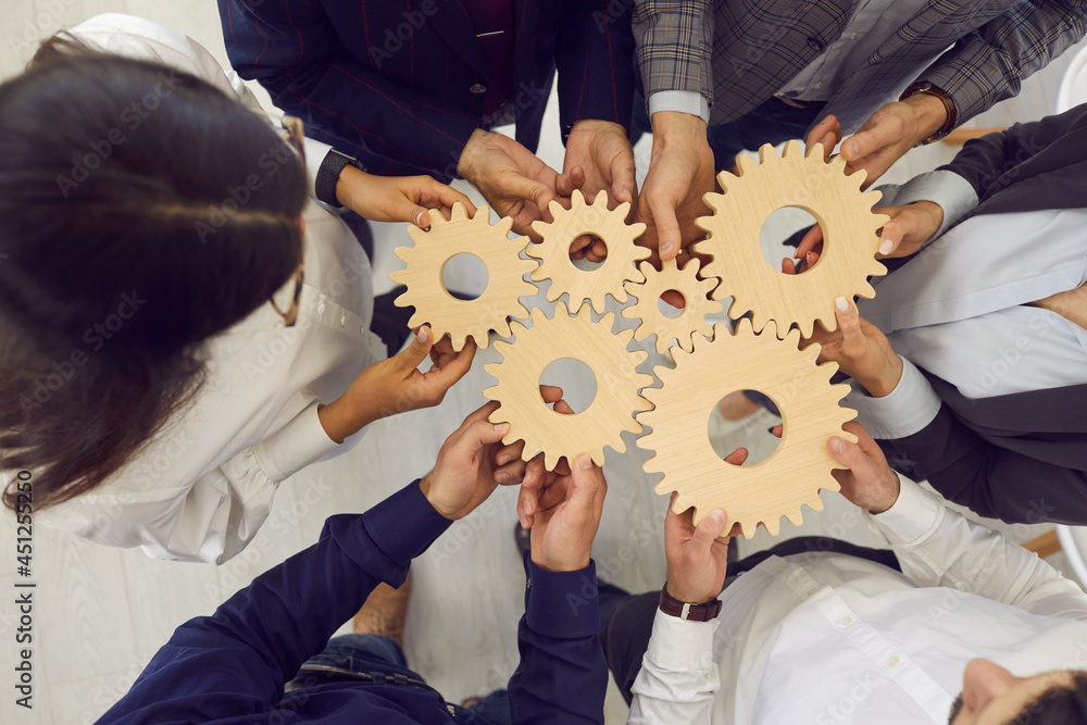 Overhead view on diverse business team people hands holding gear wheels finding working solutions. Power partnership, engineering teamwork, manage team work and company activities concept