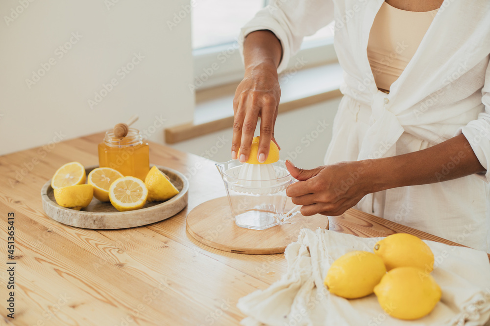 Young woman making lemonade in a kitchen of cozy house. Homemade healthy drink.