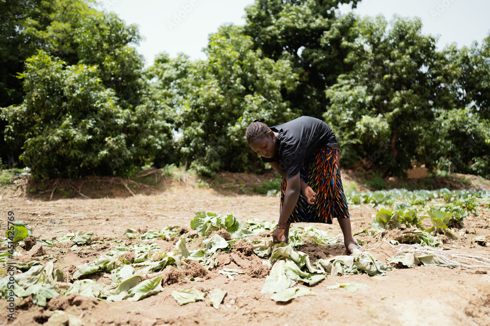 Young black woman harvesting the last remains of a poor cabbage field in West Africa