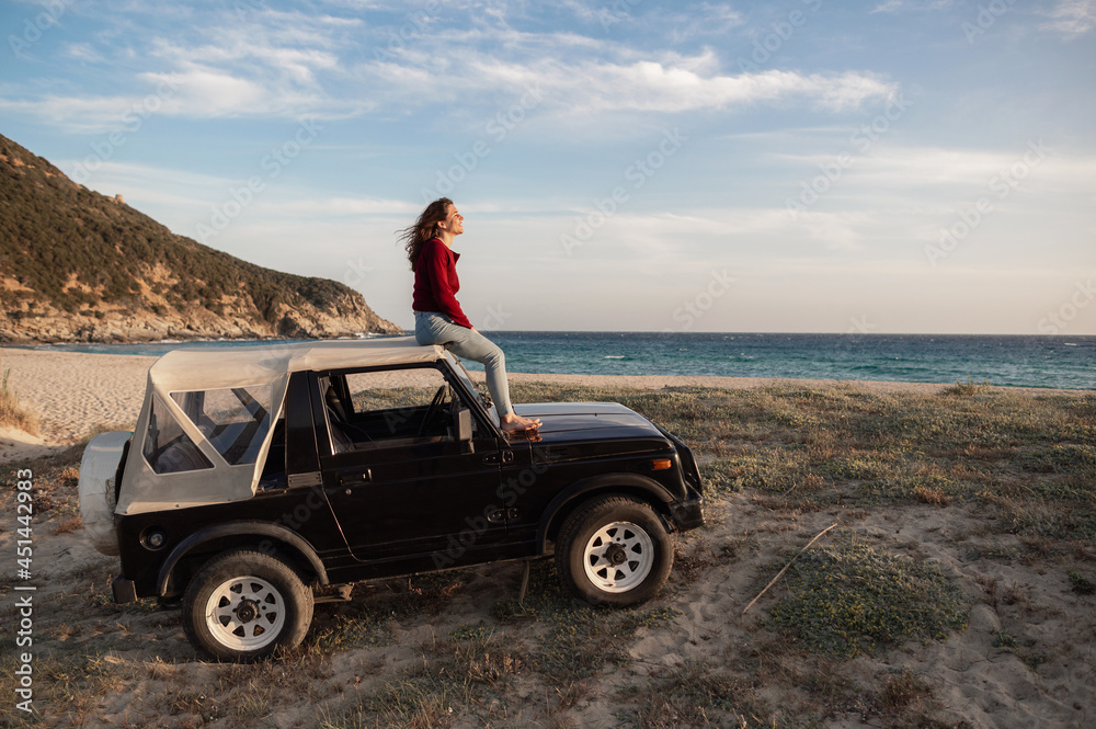 Young woman sitting on rooftop of her off-road car enjoying the wind and looking at the sea. Car parked in front of a wild beach.