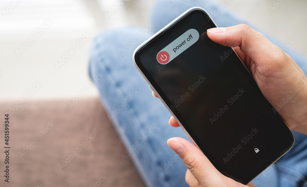 Woman hand using is sliding to turn off the mobile phone to reduce power consumption. Technology and environment concept