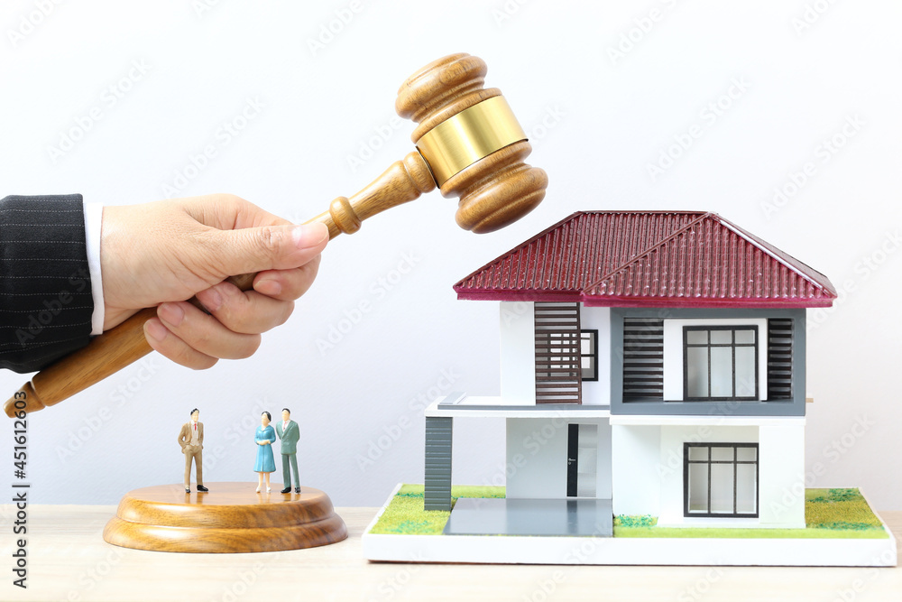 Property auction, Woman hand holding gavel wooden and model house on white background, lawyer of home real estate and ownership property concept
