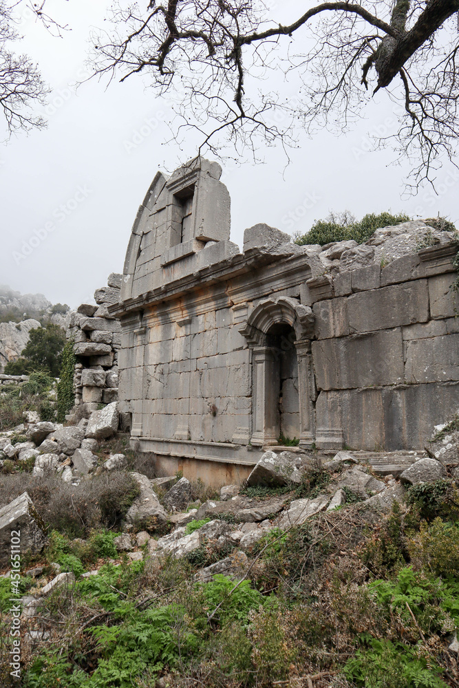 ruins of ancient Gymnasium in abandoned city Termessos in Turkey mountains