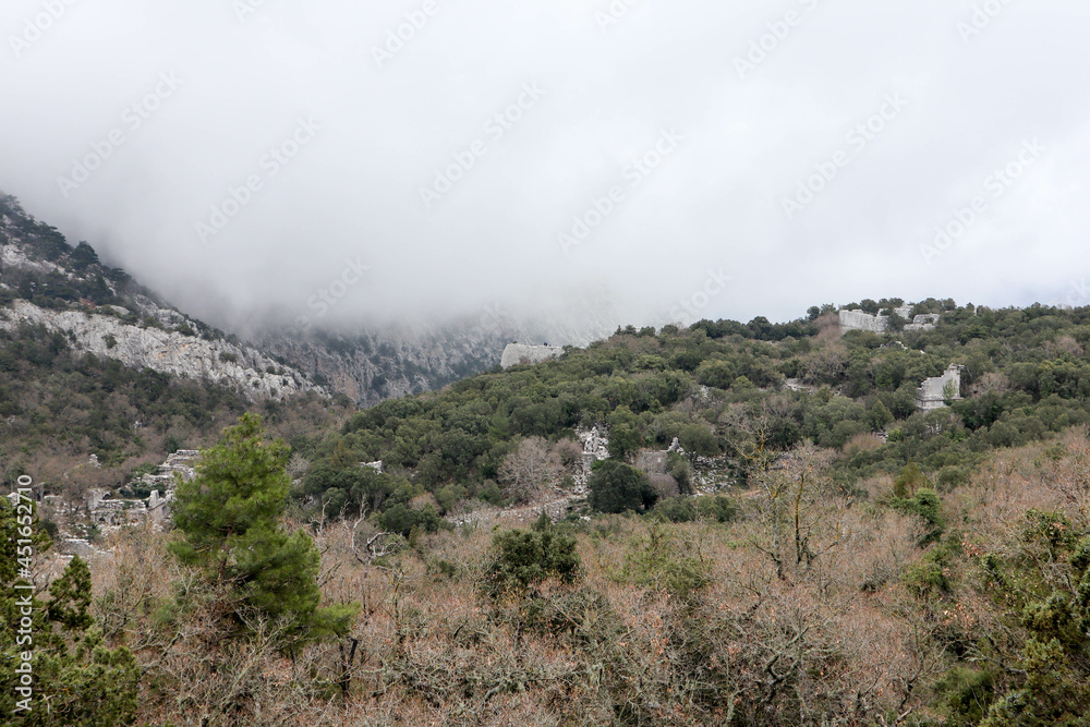 panoramic view from the top of the mountain to the ruins of ancient abandoned city Termessos in Turkey