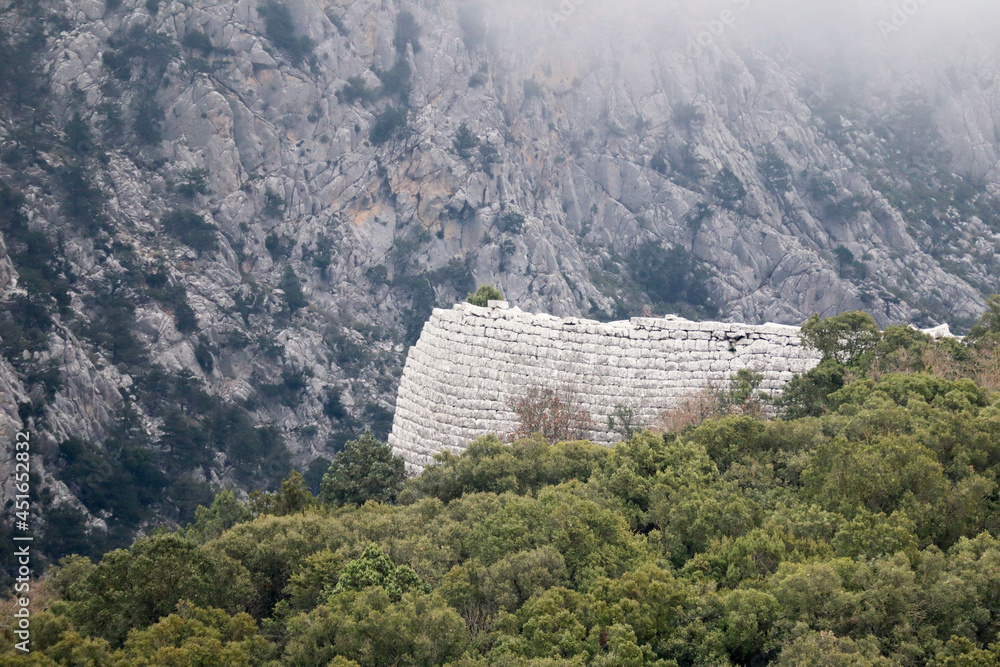 panoramic view from the top of the mountain to the ruins of ancient abandoned city Termessos in Turkey