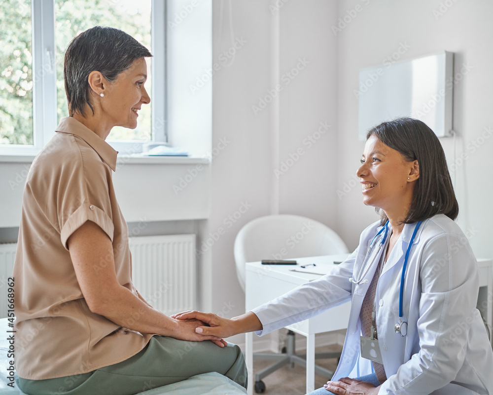 Medical ethics. Young smiling caring african female doctor supporting and comforting happy middle-aged woman patient in hospital, holding hand and expressing care during consultation in medical center