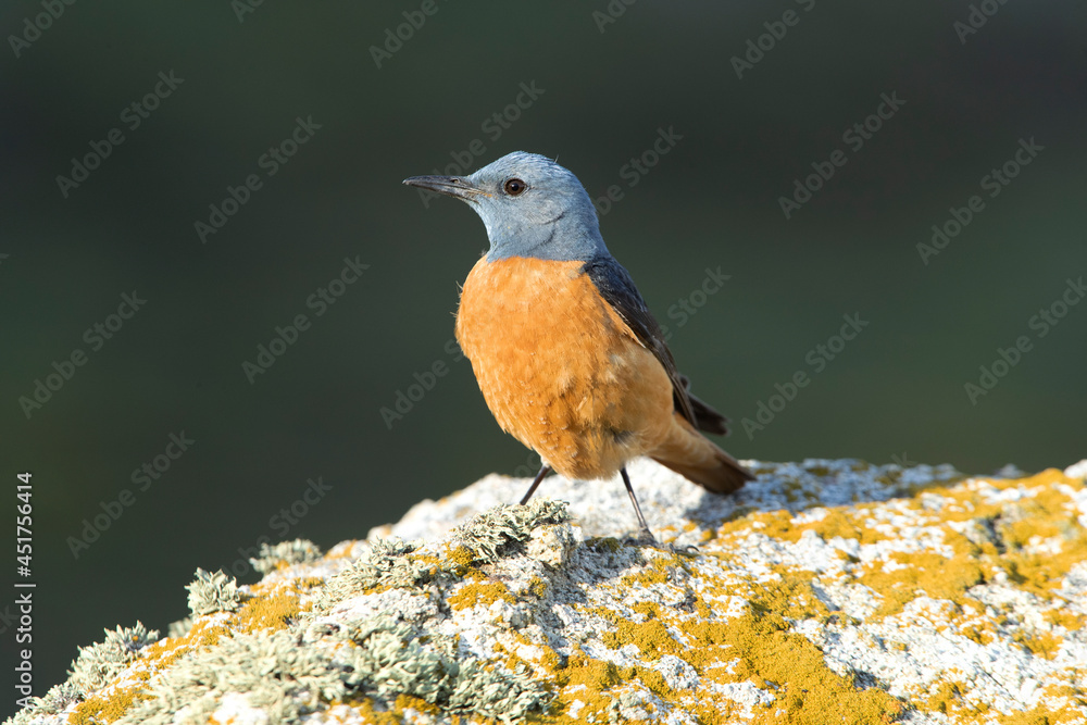 Rufous-tailed rock adult male thrush in his breeding territory with the first light of dawn