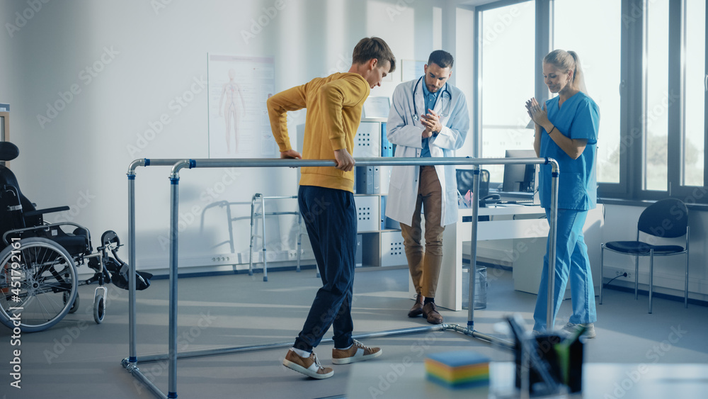Hospital Physical Therapy: Strong Patient with Injury Making First Steps, Walks Holding for Parallel Bars. Physiotherapist, Rehabilitation Doctor Assist, Help Disabled Person.
