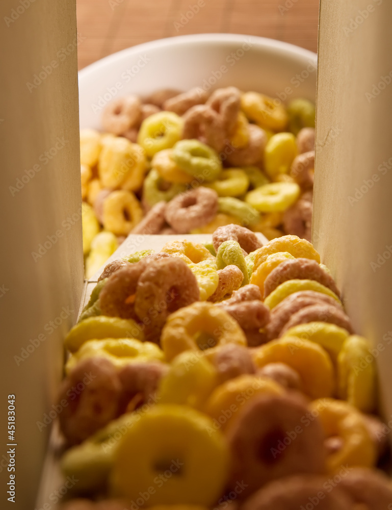 Cereal loops pouring out of a box