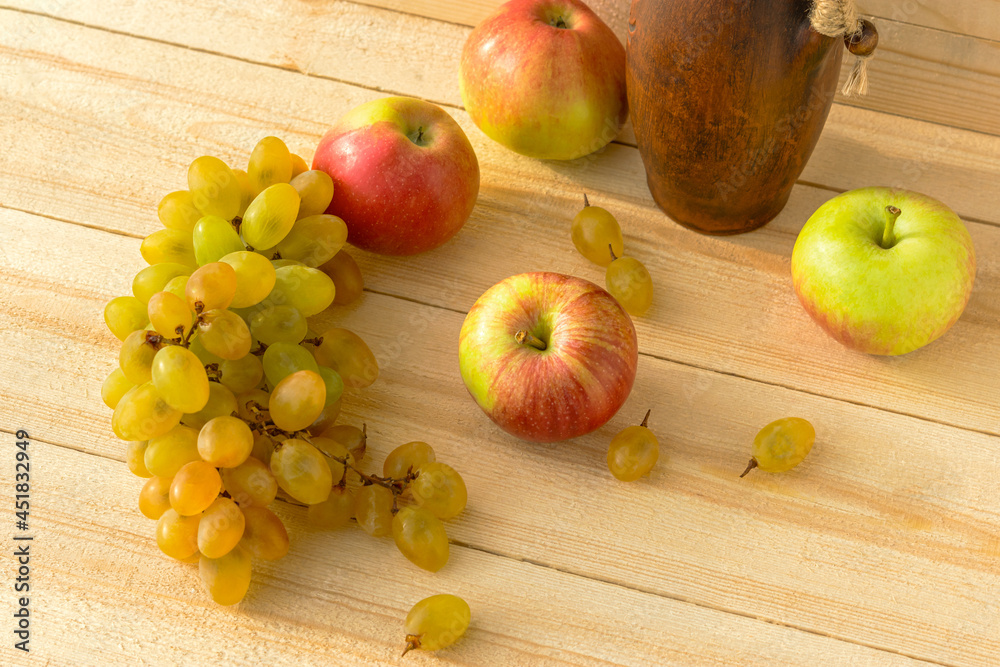 Apples grapes peaches on a wooden beige background. Still life of ripe juicy summer fruits. The concept of vitamins, proper nutrition, vegetarianism. Fruit set for a light salad. Flat layout top view