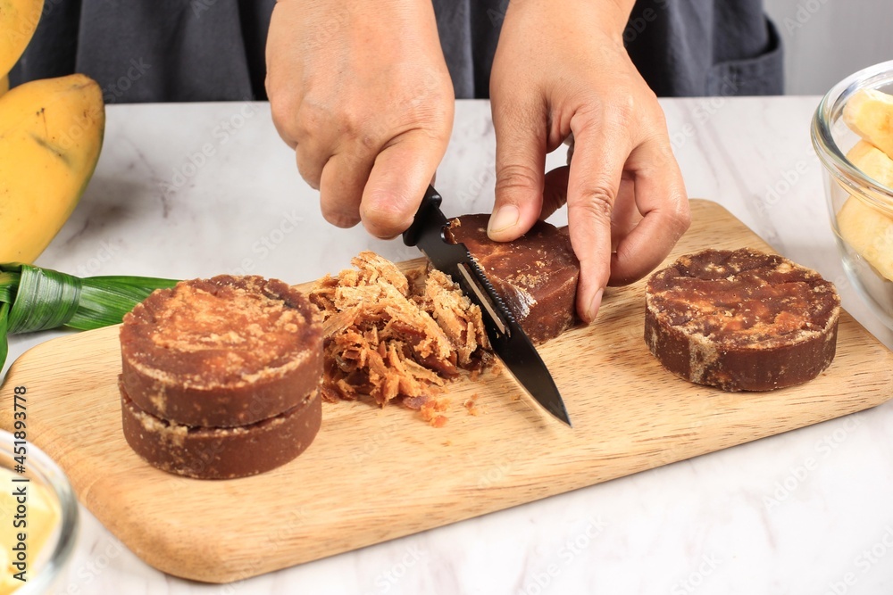 Cooking Process, Slicing Palm Sugar Block, Process Making Kolak, Traditional Indonesian Sweet Soup Made from Banana, Sweet Potato, Coconut Milk. Popular as Ramadan Breakfasting Menu