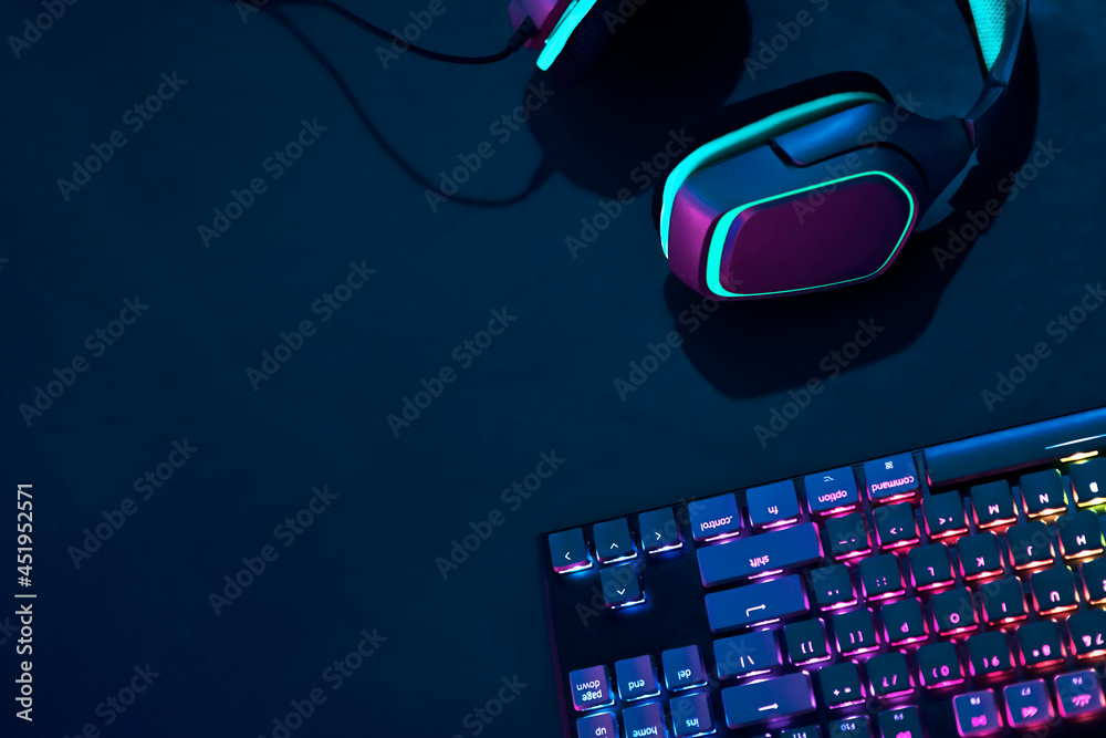 Headphones laying on desk next to rainbow colors backlighted gaming computer keyboard.