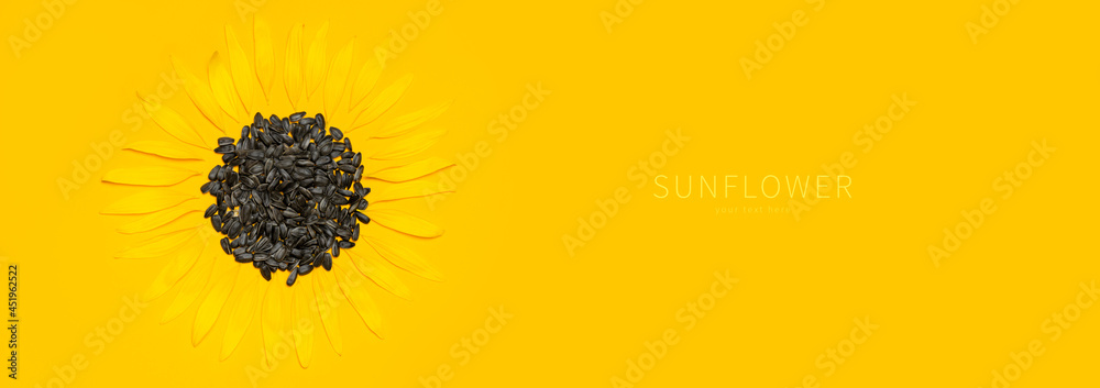 Beautiful fresh sunflower with sunflower seeds inside on yellow background. Harvest time agriculture farming. Healthy oils, food. Sunflower natural background Flower card Flat lay top view copy space