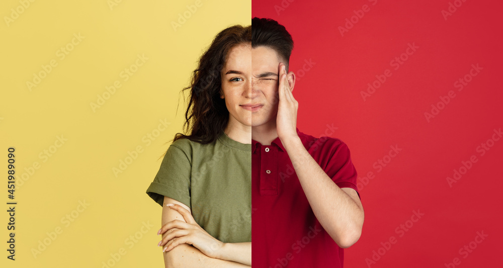 Two halves of young people faces, man and woman over colored backgrounds. Tense, stressful.