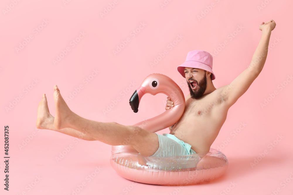 Emotional young man with inflatable ring on color background