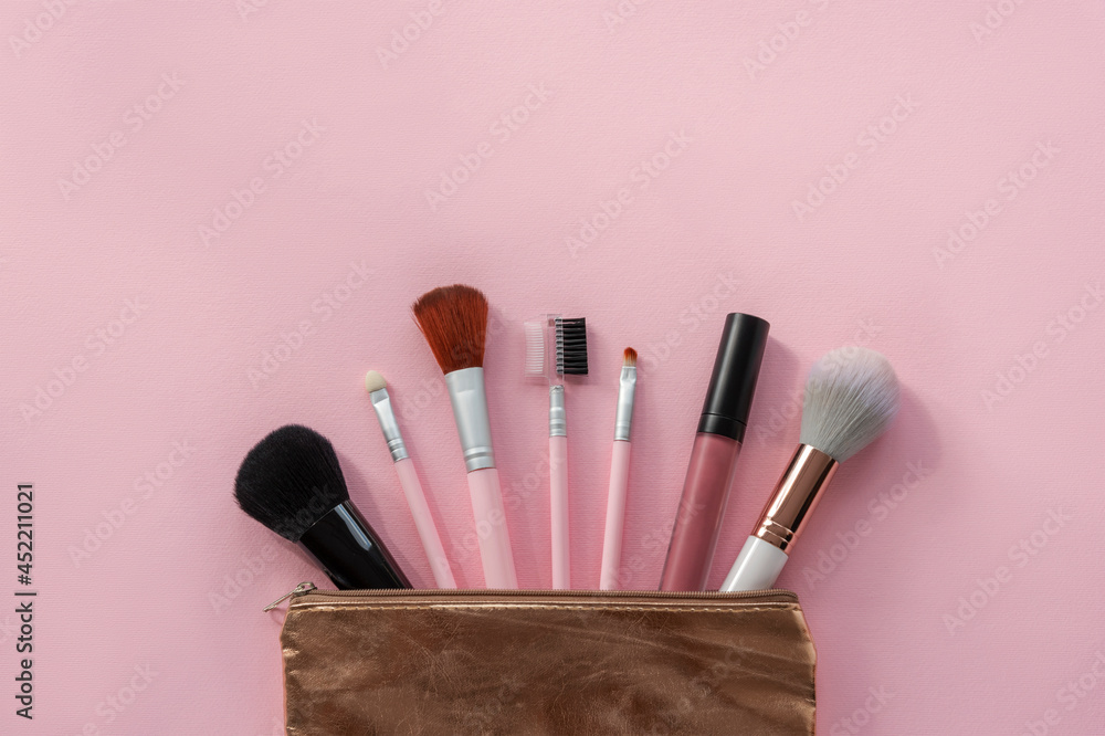 Collection of makeup brushes and lipstick in golden cosmetic bag on pink background. Beauty, fashion concept. Top view, flat lay