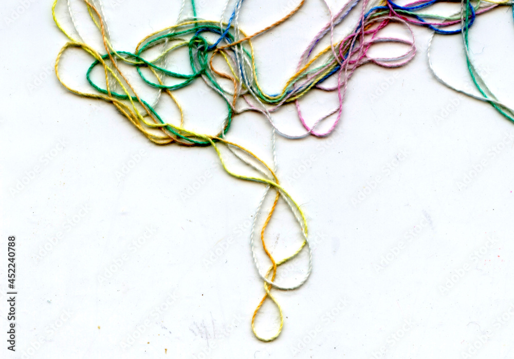 Multicolor tangled color needlecraft silk cord. Abstract color background, in white background
