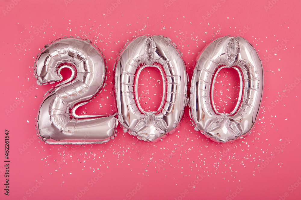 From above of silver shiny balloons demonstrating number 200 on pink background with scattered glitter