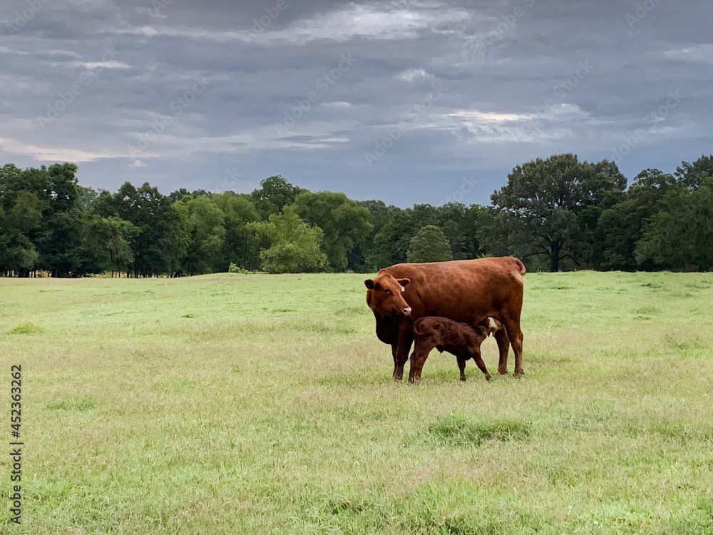 Cow and Calf pair, calf drinking milk, nursing on mother cow