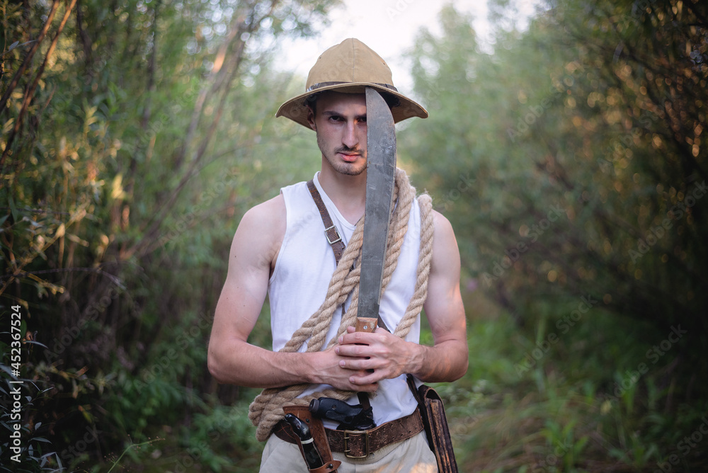 Adventurer man with machete knife in the jungle thicket concept.