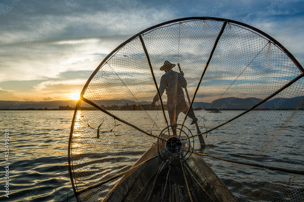 Myanmar. Inle lake. Fishermen Intha at sunset