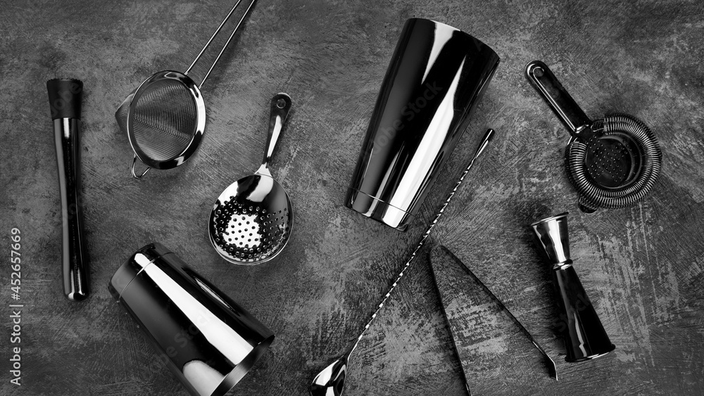 Cocktail bar equipment on dark background.