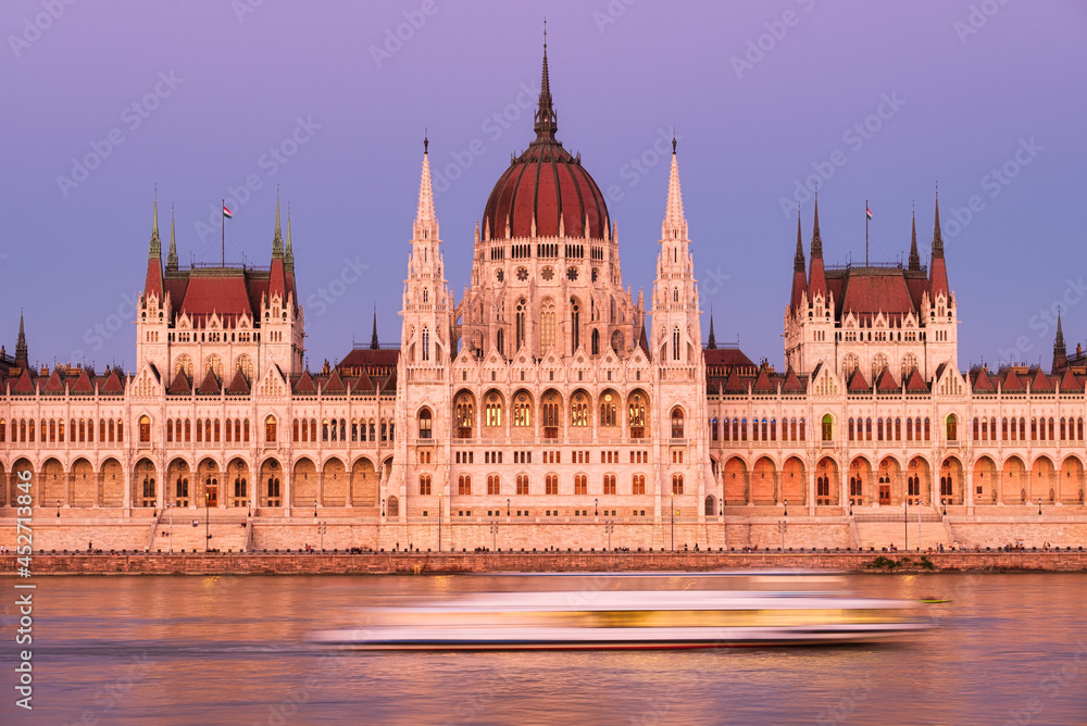 Budapest, Hungary. A classic view of the historic parliament building. Danube River and Parliament during sunset. A ferry trip on the Danube River.