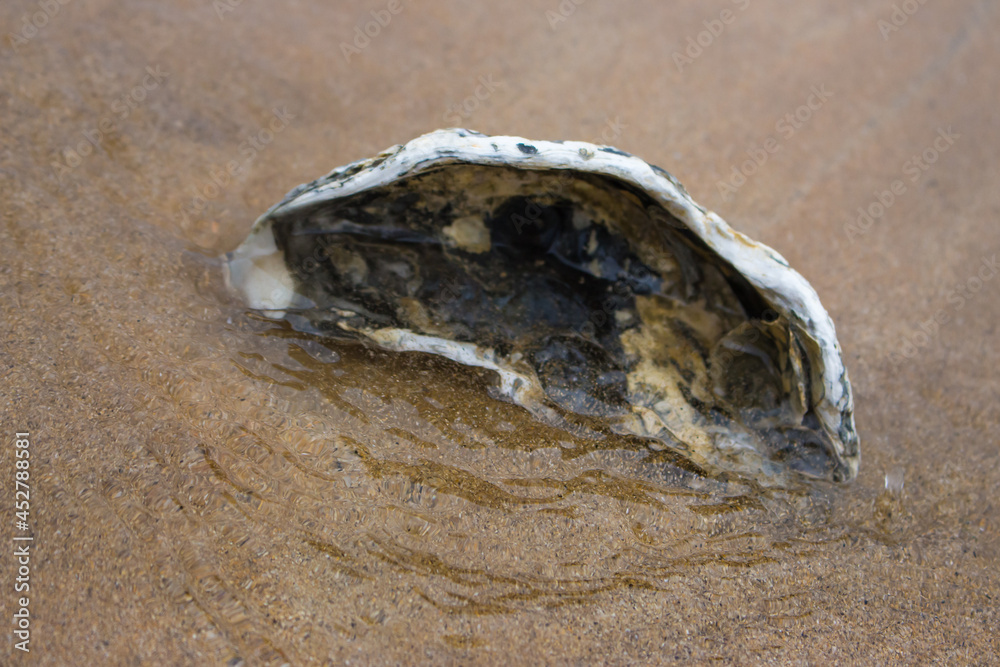 Empty oyster shell on the beach. Open shell on wet sand. Coast with mollusk shell. Coastline background. Marine life concept. Vacation in lagoon. Island nature. Seascape concept. Sea life concept.