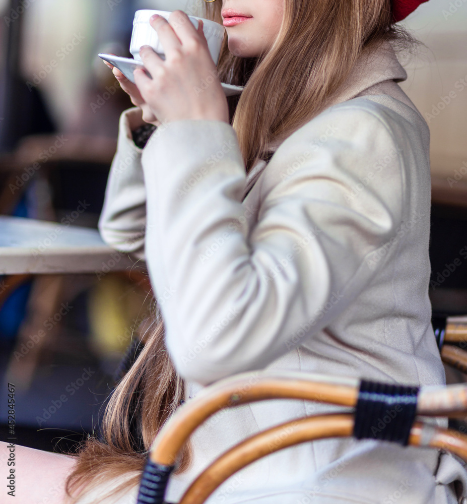 Young woman in trench coat and dress holds coffee cup and enjoys morning